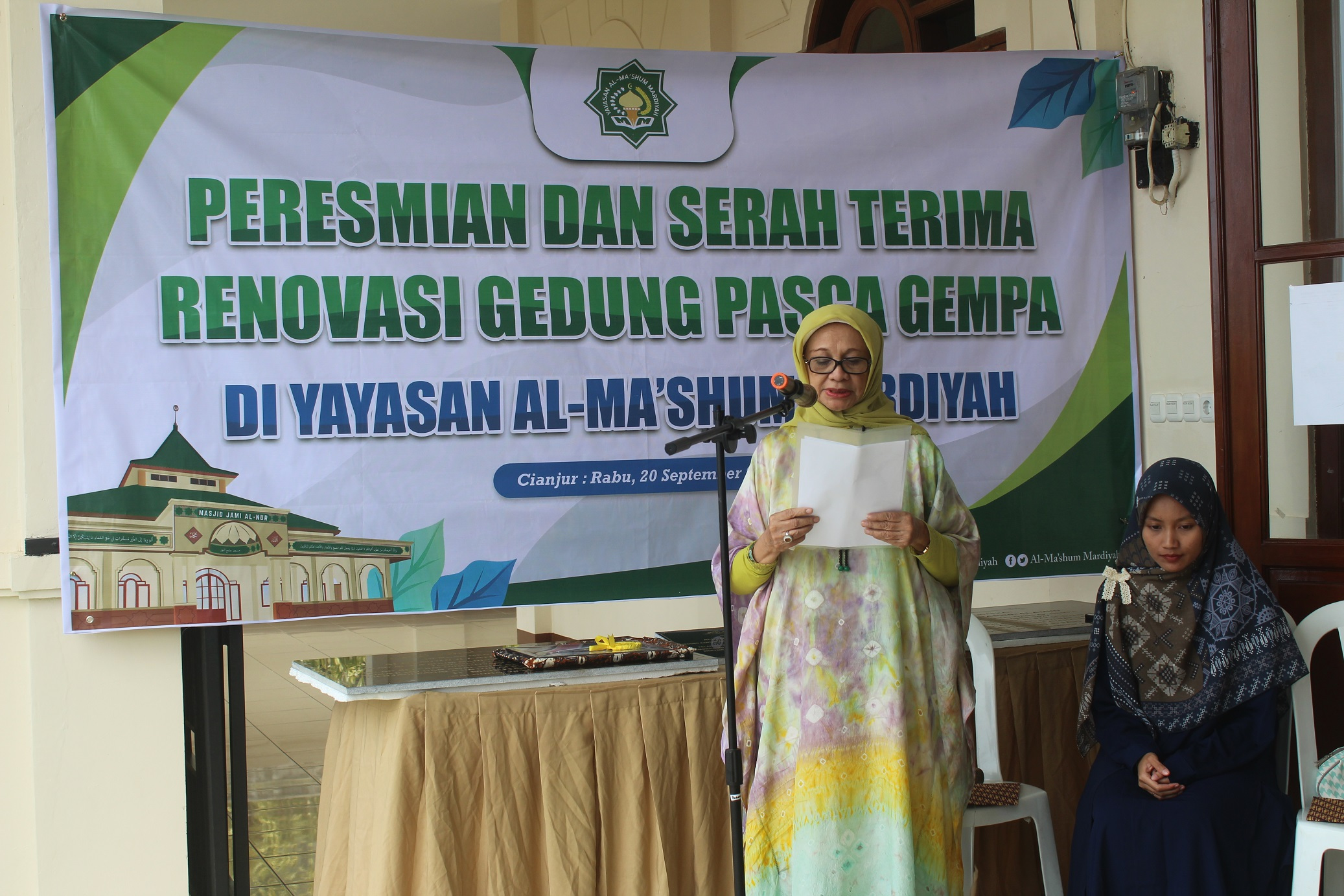 almashummardiyah.or.id - 20/09/23 | Rabu (20/09/23) Yayasan Al-Ma'shum Mardiyah melakukan peresmian dan serah terima gedung yang telah selesai direnovasi pasca gempa bumi Cianjur 2022 silam.
