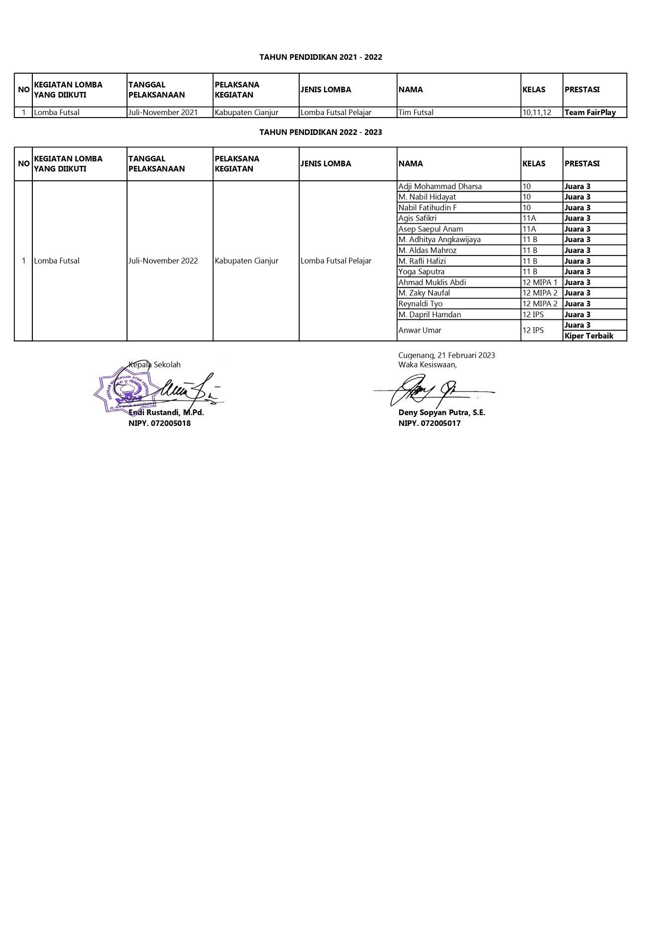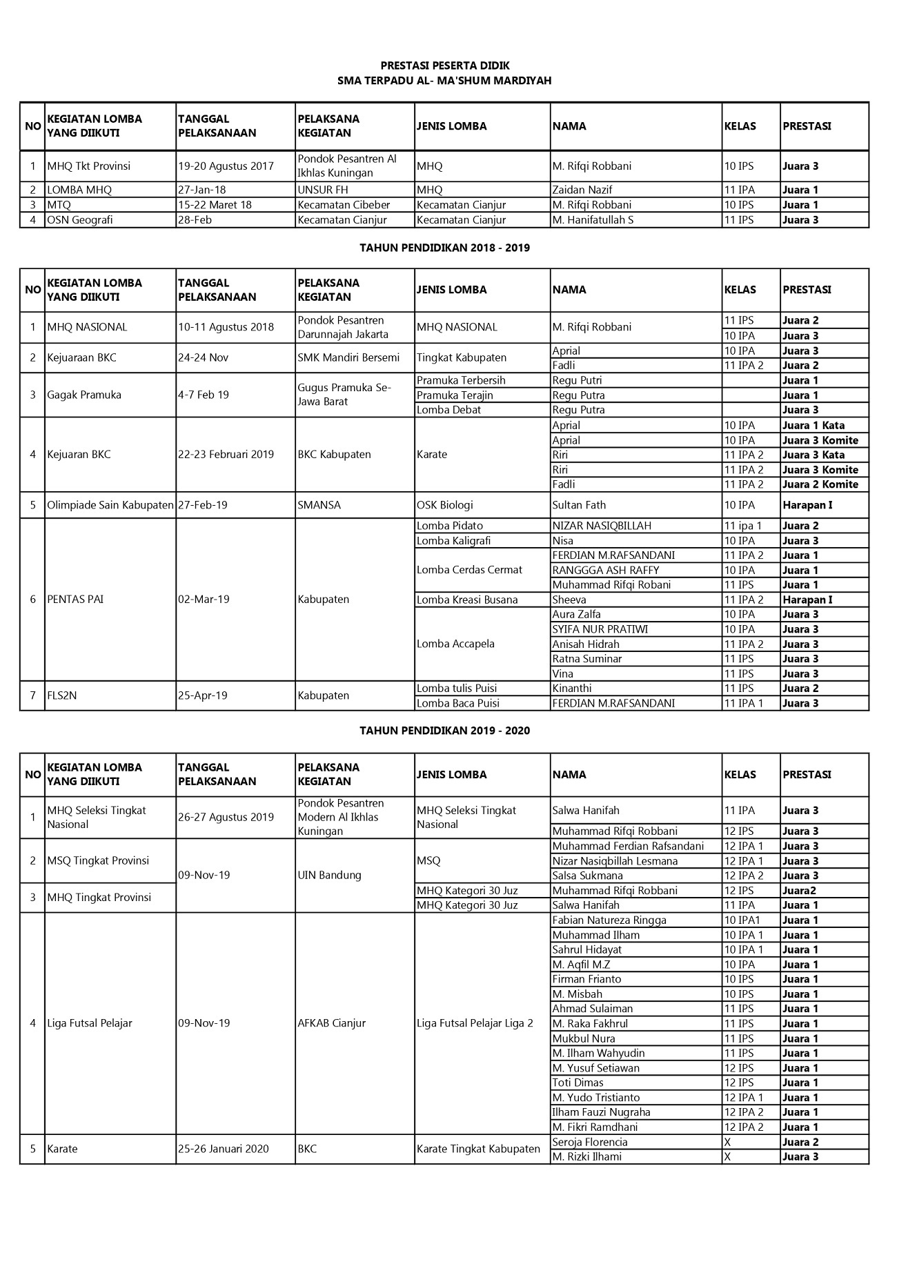 Dalam keterangan resmi yang disampaikan oleh Wakil Kepala Sekola Bidang Kesiswaan Deny Sopyan Putra, S.E.  menyatakan bahwa para peserta didiknya telah mengikuti berbagai event kejuaraan, baik dalam bidang sains, keagamaan maupun bidang olah raga, dan telah meraih beberapa gelar juara yang membanggakan.